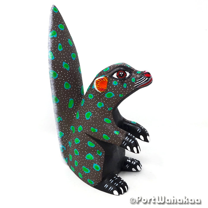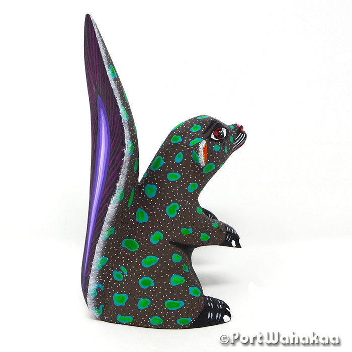 Hoja Squirrel is an exquisite and graceful creature that resides in the lush canopy of trees. It is intricately carved from a single piece of copal wood by the talented artisan, Mauricio Ramirez. Every detail, from its poised stance to its wispy purple tail, captures the beauty of nature. Elevate your collection with this elegant and refined addition.